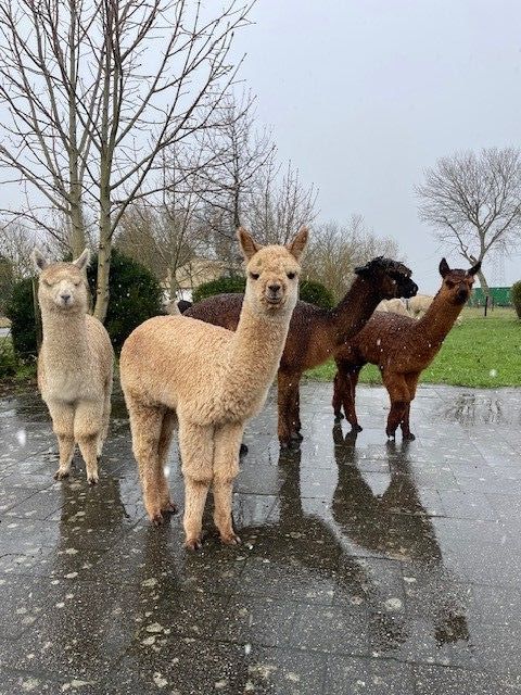 Dit zijn 4 van onze alpaca's. Wil je weten wie het zijn? Links is Jimmy, daarnaast staat Billy en Brente en de meest rechter is Kate.