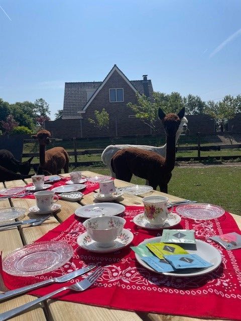 In de warme zomer maanden zitten we lekker buiten met de high tea's in de wei van de alpaca's. Dan kan je lekker genieten van de zon en de gezelligheid van de alpaca's om je heen.